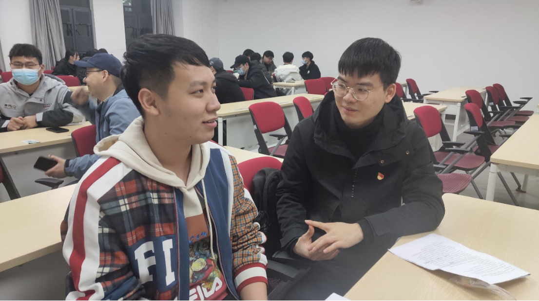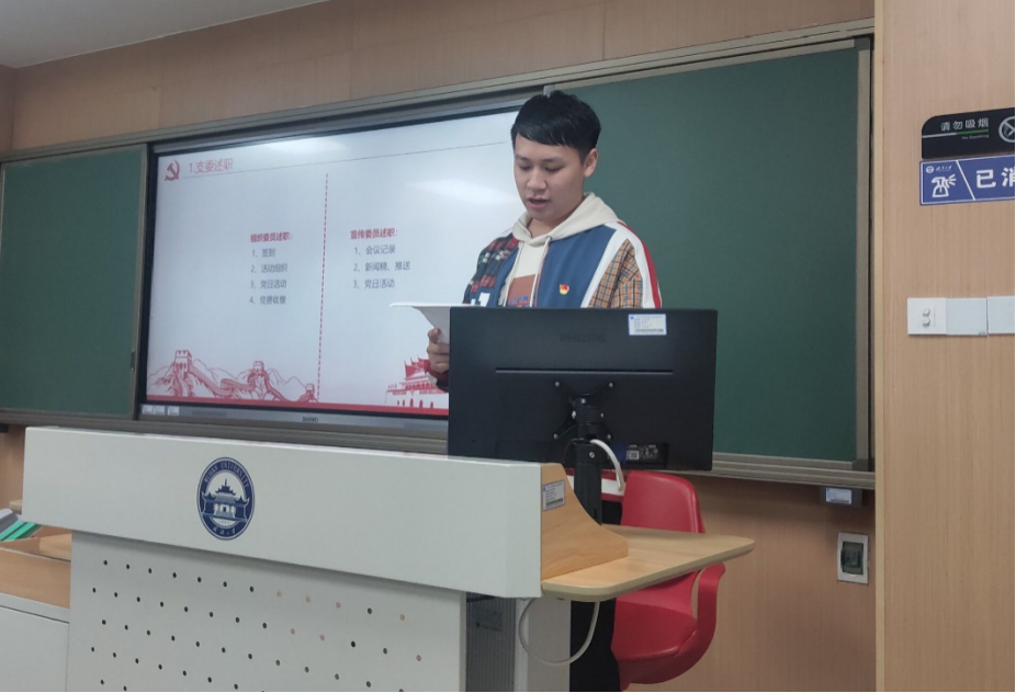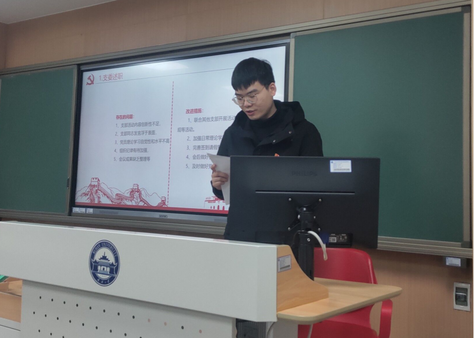 接着进行会议第三项——组织生活会。众所周知,组织生活会是党支部或党小组以交流思想、总结经验教训、开展批评与自我批评为中心内容的组织生活制度,我们认真落实学院关于开展丰富组织生活会内容的要求。首先就由三位支委对2021年支部工作进行述职,支部书记何波同志根据支部党员的组成、“三会一课”内容开展、支部及支部党员所获荣誉以及支部存在的问题四个方面介绍。建工二支部在过去的一年里,支部获得学院支部风采大赛三等奖以及党史知识竞赛二等奖,三位党员获评学院优秀党员,可谓收获颇丰。但是依旧存在支部活动内容创新性不足、支部同志发言浮于表面、党员理论学习自觉性和水平不高等问题,并一一提出了解决方案,将在后续工作开展中逐渐改进。紧接着组织委员姜涵中就签到、活动组织、党日活动参与、党费收缴四个方面进行汇报。宣传委员陈得锋则着重于介绍会议记录、新闻稿、推送以及党日活动。三位支委均表示将在后续工作中为支部工作添砖加瓦,更好地为支部党员服务,听取支部党员以及党总支相关建议及意见,把支部建设好。