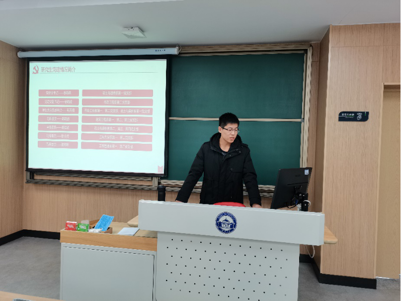 会议第二项,积聚建设新优势。研究生各党支部书记依次分享了本支部建设中的亮点工作,市政一支部创新支部主题党日形式,以知识竞答、微辩论、专题宣讲等方式开展活动;市政二支部积极落实“我为群众办实事”,组织党员同志在结构楼门口设立停车指示牌,解决同学们出行困难问题;岩土一支部日常学习与分享氛围浓厚,鼓励党员同志每周不定期分享时事要闻;岩土二支部活动形式丰富,开展了“贺冬珈节庆,玉壶存冰心”暖心公益主题党日活动、建党百年等系列活动;岩土三支部重视理论学习反馈,要求党员同志定期提交学习心得;岩土四支部善于利用资源,邀请往届优秀党员同志分析学习工作经验;建工一支部支部学习氛围融洽,传达的先进思想支部同志们都能努力学习;建工二支部与群众联系密切,支部成员经常开展卫生打扫、科研小讲堂等活动;建工三支部关心时事政治,支部内经常讨论国家政治大事,有着强烈地民族自豪感和集体荣誉感;工管一支部支部成员配合工作,支部内部各成员配合度高,能较好地完成各项任务;工管二支部做到知识学习常态化,引导党员同志利用好学习强国平台,保持学习习惯等;力学一支部支委会认真负责,分工明确,党支部委员会的自身建设良好;力学二支部党员遵章守纪,支部内部党员的纪律意识较强。