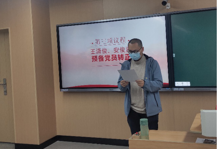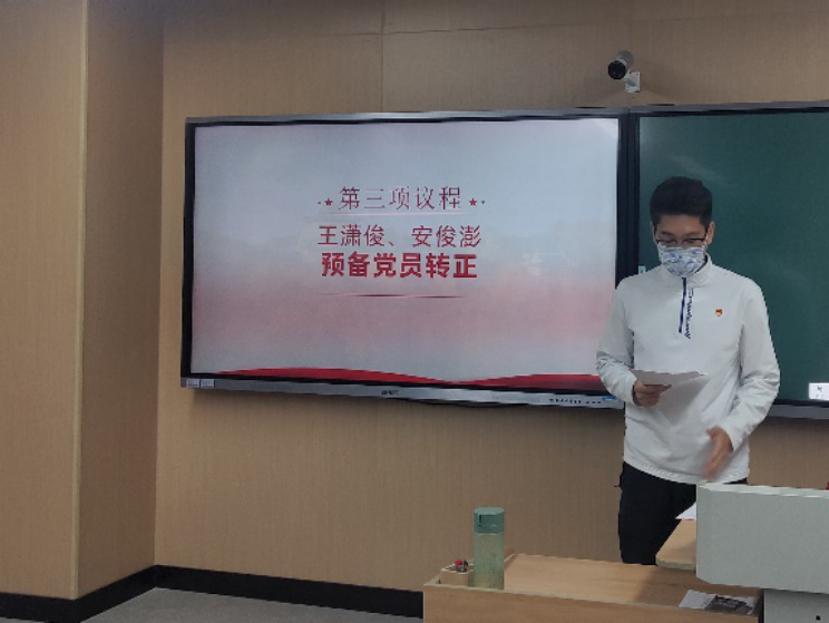 会议第二项内容是关于王潇俊、安俊澎两位同志的转正汇报。王潇俊同志汇报了在预备期的一年中自己的政治学习情况和科研进展情况,正确地认识到了自己在党史学习方面的欠缺以及与支部内同志的交流较少等不足,表明成为一名正式党员后,将不断地改善自身、提升自我。安俊澎同志汇报了自己在预备期内参加的一系列党内活动,通过这些活动他学到了党的光荣传统,增强了党性修养,同时他还在学习生活中积极关心帮助同学并多次参加志愿活动等,最后该同志反思了自己在学习中存在浮躁情绪等问题,并决心通过改正态度和加强理论学习等方式来解决。随后大会进行讨论,与会党员发表了对即将转正的预备党员的意见,并给予了通过“学习强国”等APP来日常学习党史、提高党性修养等诚恳建议。经支部大会全体正式党员无记名投票决定,同意推荐王潇俊、安俊澎两位同志按期转为中共正式党员。