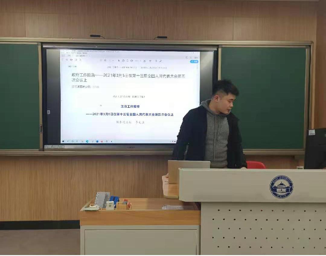 大会伊始,支部书记陈梓韬带领全体会议人员学习2021年《政府工作报告》。他从各个方面认真细致的进行解读,号召全体党员提高政治站位,深入学习领会《政府工作报告》精神。他强调,作为一名合格党员,必须增强“四个意识”、坚定“四个自信”、做到“两个维护”,切实贯彻好党中央的路线方针政策,落实好上级党组织的各项工作部署。之后王中伟同志就《政府工作报告》补充了自己的学习心得,杨涛同志也分享了在扶贫的政策下家乡的5年变化。