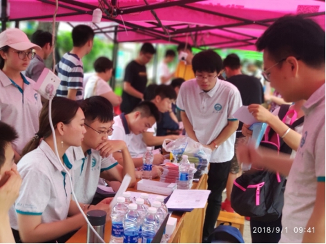 上午7:00,新生报到工作正式开始。辅导员伍阳老师、兼职辅导员刘赵昊旻和研究生会的同学们早早来到工学部体育馆前的小广场,做好了迎新的一系列准备工作。大家分工明确,配合默契,对报到的新生都给予积极的引导和热情的关怀,现场气氛其乐融融。