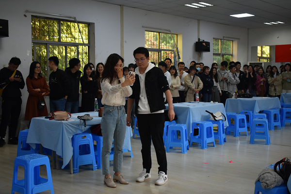 活动最后一个环节是CP游戏。首先是“戴口罩”,每组选一男一女参加,男生站定,女生蒙眼转10圈后为男生戴口罩,成功戴上的组根据用时长短排序加分。接下来是“单眼wink”,以小组为单位派出一男一女参加,根据女生左右眼的眨眼次数由男生猜测数字,同时工作人员进行计时,每组根据用时长短排序进行加分。最后是“爱的爆破”,每次都选两组参加,每组选一男一女,用丝带将一个同学的左腿和另一同学的右腿绑在一起,场地中间放15-20个气球,两组进行竞争,踩气球个数多的组获胜。
