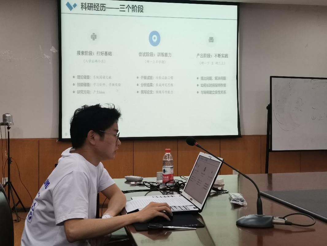 朱加业同学首先做了内容为“科研经历-从摸索到高效产出”的经验分享,分别从摸索阶段、尝试阶段和产出阶段三个方面与同学们分享了自己从研究生入学以来一步一步探索、思考的相关经验,其中遇到科研中种种困难的解决方式更是吸引了同学们的兴趣,同学们也根据自己的情况进行提问。