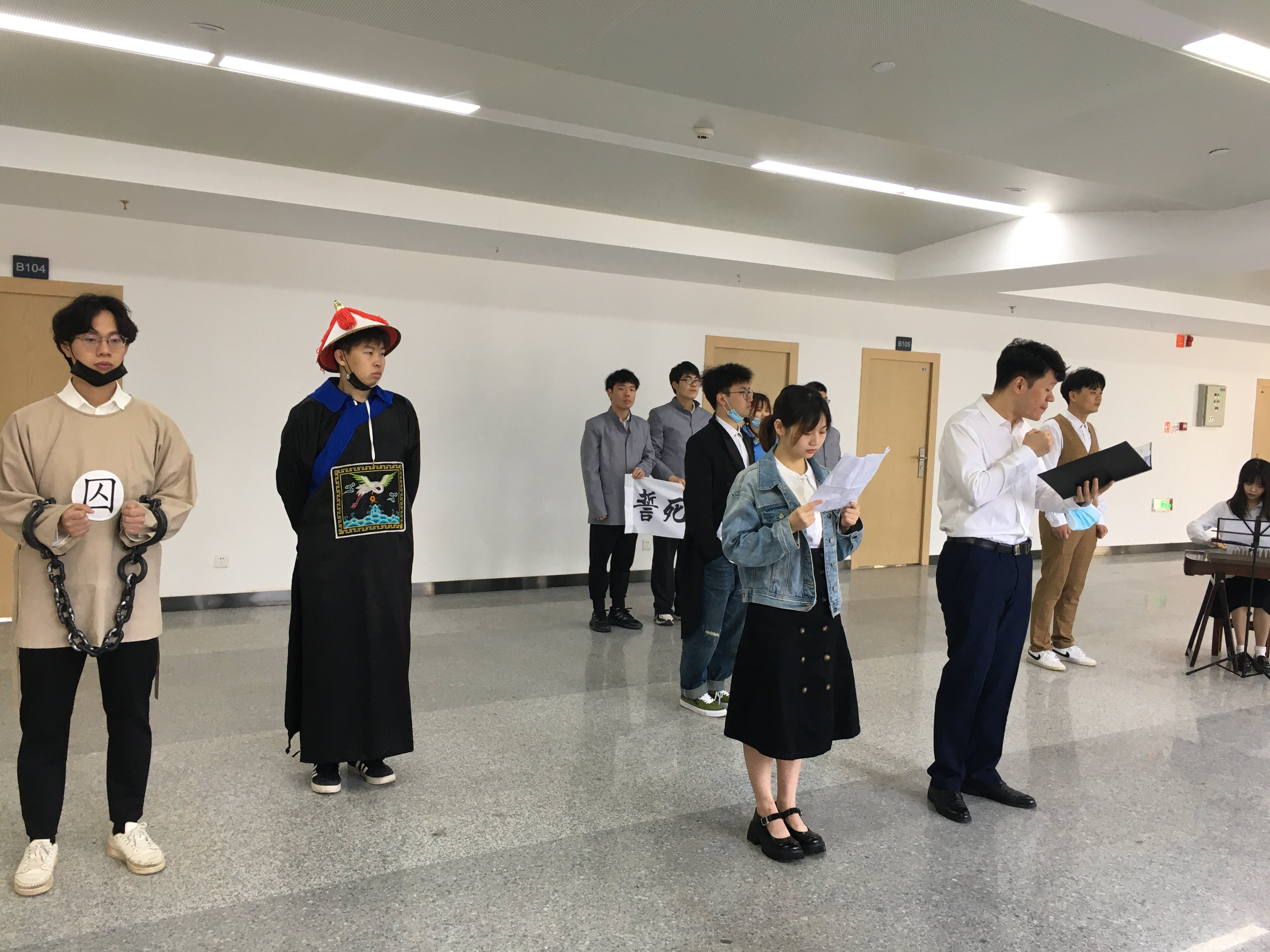 情景诗朗诵伴随阵阵古筝而起,带我们领略革命精神,感知历史人物胸襟。在戴望舒《我用残损的手掌》朗诵中穿插着林觉民广州起义、巴黎和会、中共一大等情景再现,英雄们用血与肉筑起希望与未来,声声朗诵,阵阵呐喊,让我们感受时间变迁,了解华夏大地经过的风风雨雨。一路走来,炎黄子孙从不放弃,克服困难,勇往直前。中国共产党的出现,是中国由一个积贫积弱的国家走向独立自强的起点。而百年以来,每一次阶段目标的实现都是新目标的开始,每一段努力的终点都是新的起点。