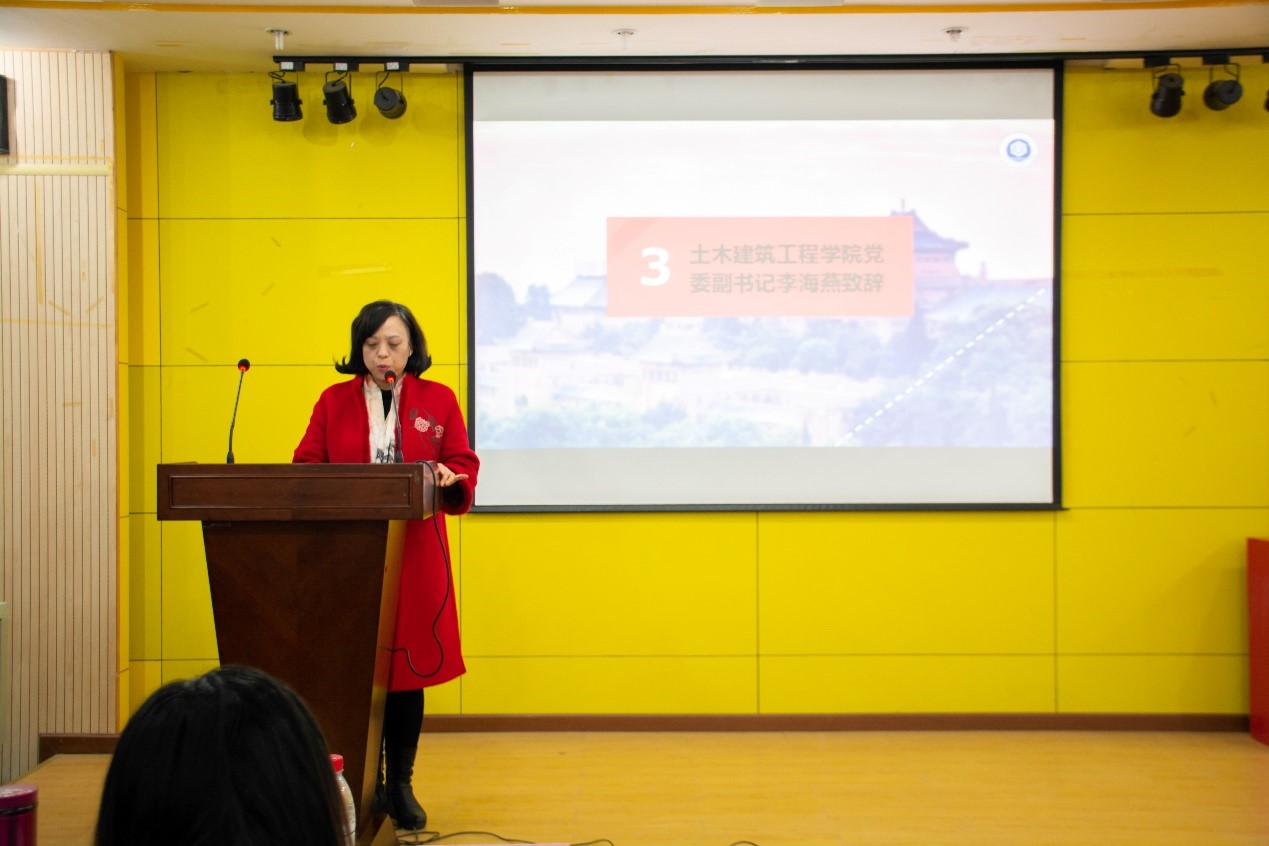 Bsports官网党委副书记李海燕老师充分肯定过去一年里Bsports官网研究生会在学术活动、文体活动、实习实践以及就业方面所取得的成就。并对新一届研究生会主席团和其他学生干部提出几点要求和希望:一、坚持“以服务为本”的工作理念;二、注重自身综合素质的培养和提高;三、积蓄敢于突破的勇气。希望新主席团成员能够努力发扬Bsports官网“勇于担当、追求卓越”的精神,成长成为顶天立地的武大土建人。