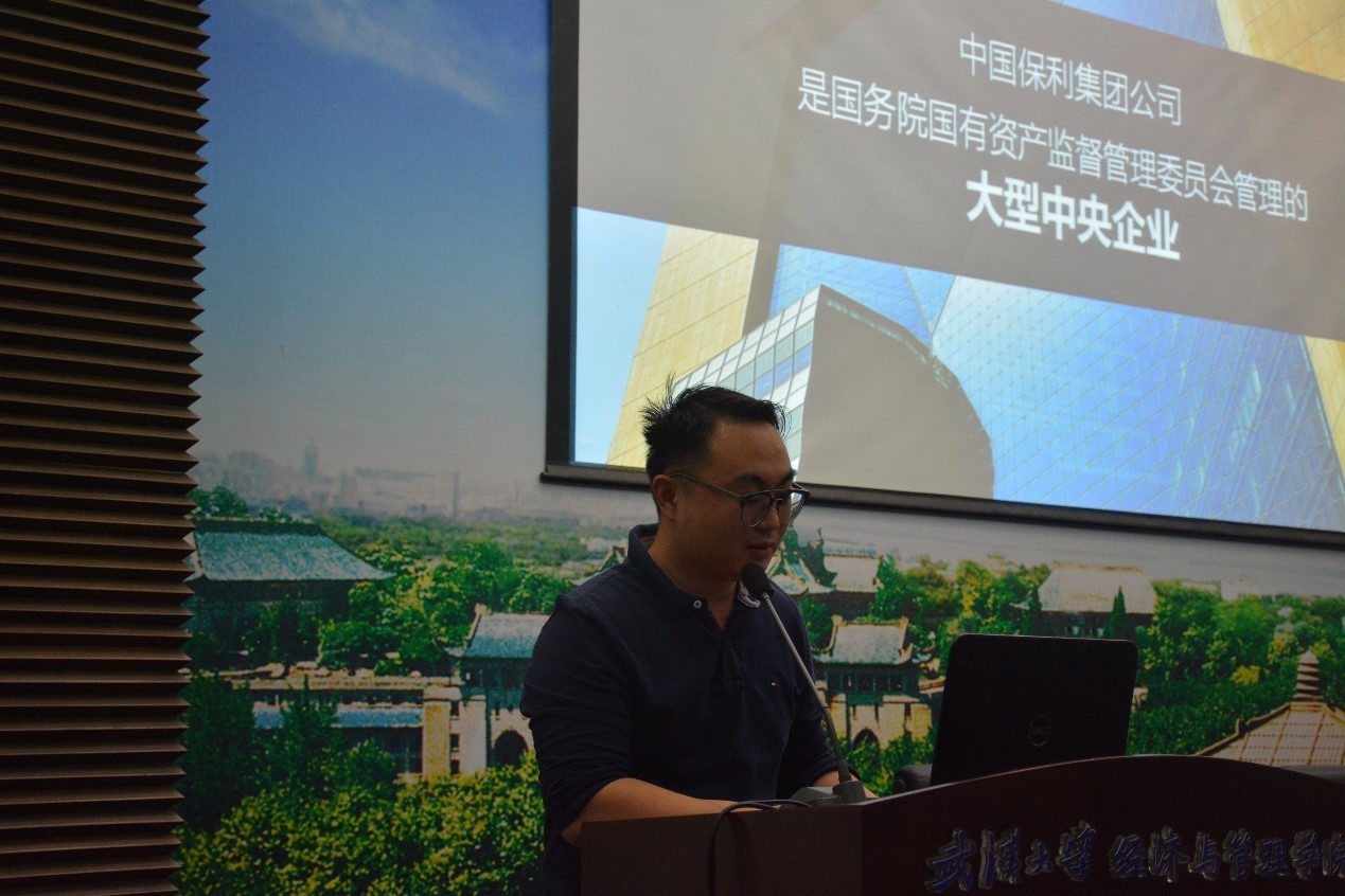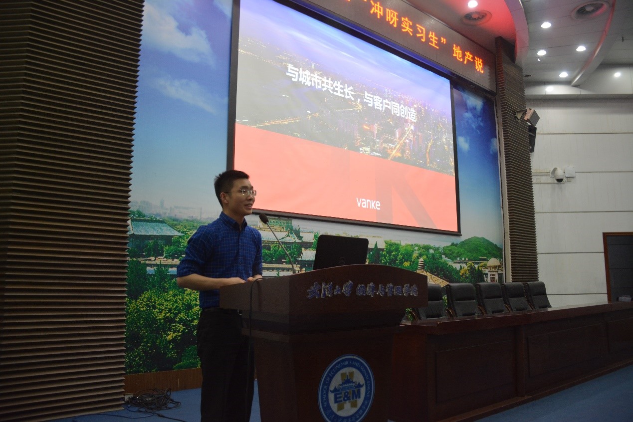 沈潇(湖北保利投资管理部经理)先生首先通过视频介绍宣传了保利发展,并进行了简短的企业介绍和实习生计划介绍。他就投资岗的内容、努力方向和发展前景三个方面提出了自己的见解,并提供了同学们一些求职意见,沈先生言辞幽默,现场笑声不断。