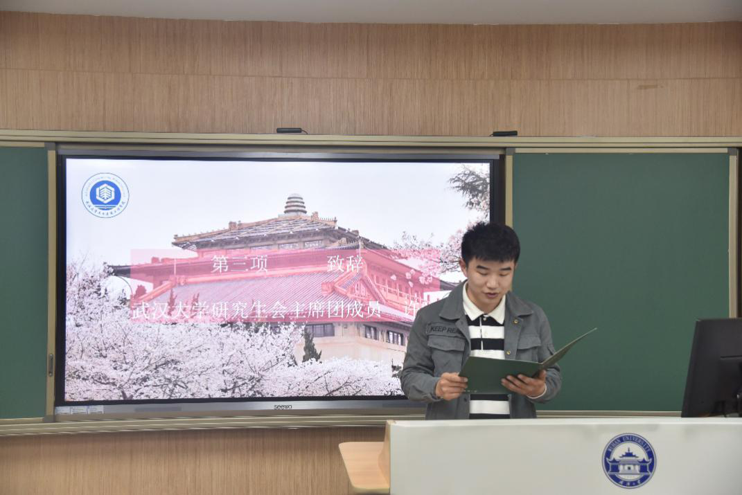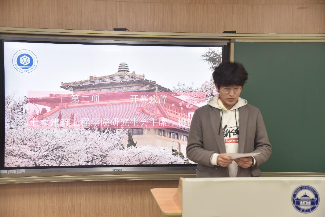 会议伊始,主持人带领全体与会成员奏唱国歌,完毕全体成员落座观看研会风采展示视频。之后土建学院研究生会主席柳镕林和研究生会主席团成员许昕先后发言。柳镕林同学总结了整体土建研会的工作开展情况,并对于下一步工作做出了展望,表示土建研会要再接再厉、争创佳绩。许昕同学对土建学院近期开展的活动进行了充分的肯定,同时希望加强校院研会的联动,以更好地为大家服务。