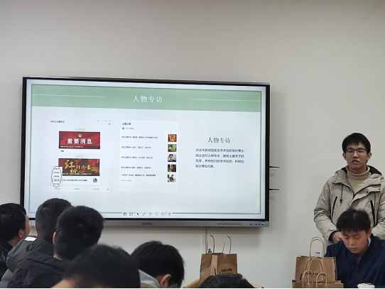 接下来是新闻宣传部的负责人王国骏代表新闻宣传部进行工作汇报,新闻宣传部这学期的工作主要有研究生会微信公众号的运营、记录研究生会举办的各种活动、丰富部门内部工作及配合协助其他部门的工作,重点是人物专访和思想领航工作。针对人物专访工作,于瀛洋老师提出可以事先搜集问题汇总的建议,让采访工作更加顺利。关于思想领航方面,徐晓瑜老师勉励同学们要提高对自己综合素质的培养和锻炼,在日常生活中要提高自己“做”、“写”、“说”的能力,把自身的发展同国家的发展结合起来,即使是做一些小事,也会给国家的发展带来动力,我们要关心国家、关心社会、关心自己,做一个真正对社会有用的人。此外,徐晓瑜老师还提出给同学们做一次二十大精神报告,跟同学们一起学习二十大精神。于瀛洋老师也发表了自己的看法并结合自己的亲身经历告诉同学们,通过阅读精彩的文章可以提升自己的知识储备,在未来某一天也许可以借鉴,对个人能力是有提升的。