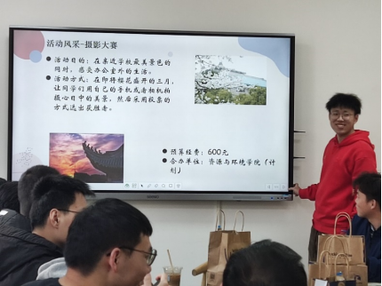 接下来是文体部的负责人林梦繁代表文体部进行汇报,文体部本学期的工作主要有负责研究生羽毛球赛、研究生篮球赛、集体舞大赛、爱心捐步活动、研究生乒乓球赛及毕业季文体活动。文体部这学期的工作比较多,其他各部门也会协助文体部举办这些活动。于瀛洋老师对文体部的工作安排提出建议,让文体部能更好地完成本学期的工作。