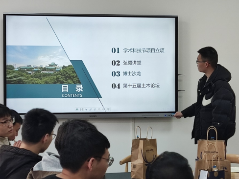 接下来是学术部的负责人袁志文代表学术部进行工作汇报,学术部这学期的工作包括学术科技立项、弘毅讲堂、校级博士沙龙及第十五届土木工程与力学研究生学术论坛,袁志文同学详细地汇报了这些工作的具体内容。于瀛洋老师对学术部的工作安排提出建议,给学术部今后的工作开展提供了帮助。