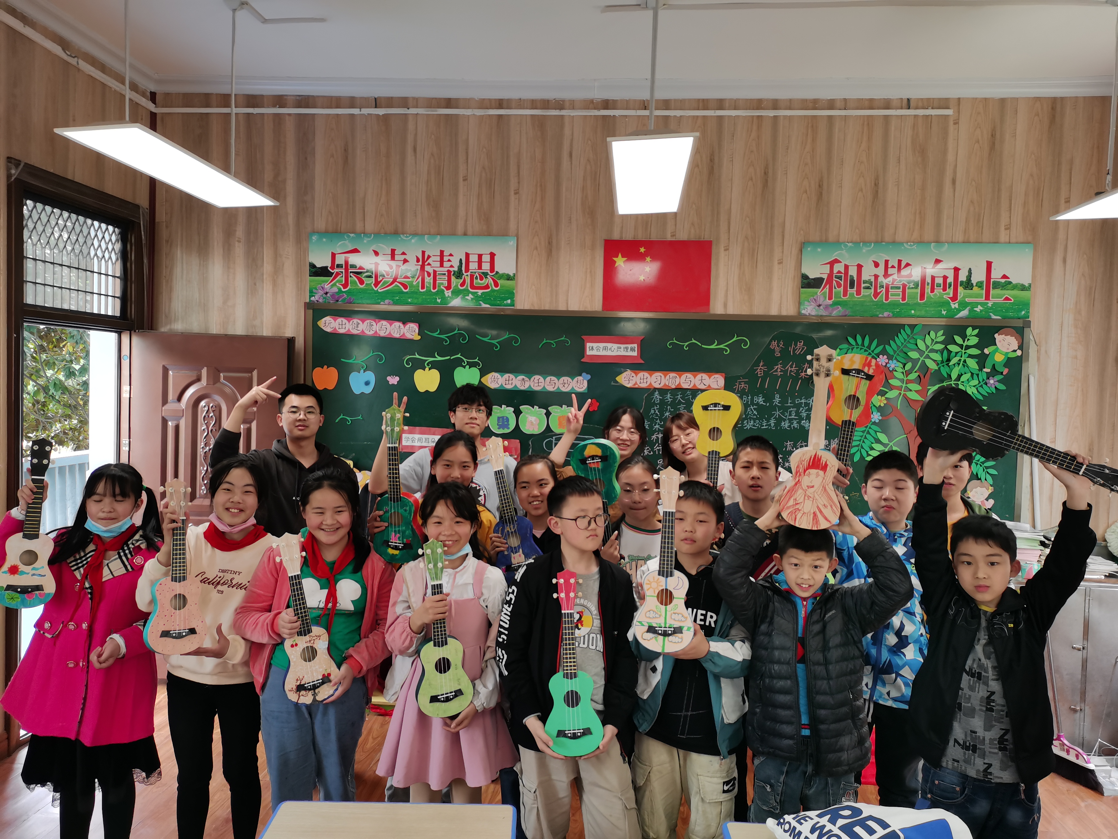随后志愿队安排开展尤克里里手工制作活动,旨在培养孩子们创意思维、动手能力及合作意识。各班学生以小组形式集体创作,将日月星辰、车马船帆融入琴身构型里,孩稚天马行空的想象力跃然纸上,或青枝白日、或漆夜星汉、或澹澹一舟、或葱茏轻霜。小朋友们围坐在志愿者身边构思绘图,笔墨交错间,同时是互帮互助的友好表现,是忌骄忌躁的耐心培养。
