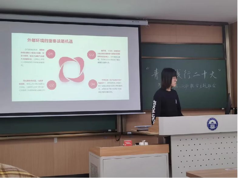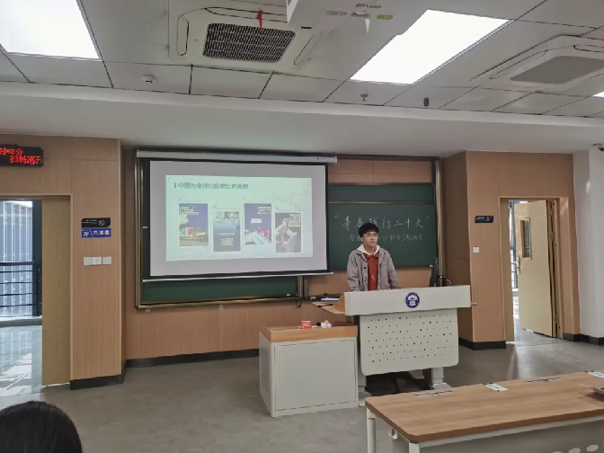 接着,是党的二十大精神学习,勒文瑄同学为同学们讲解了新时代十年的伟大变革和我们新时代青年人才的战略机遇,勉励大家以身边优秀的同学为榜样,刻苦学习,不懈奋斗践行党的二十大精神。