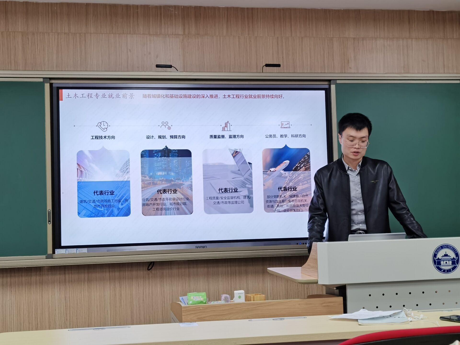 于飞则以视频介绍了土木工程专业某些岗位的特点,在视频之后,他告诉新生土木类学生并非只有工地一个去处,高等学府出来的土木人有更多样化的选择。于飞举了工程技术、设计规划、质量监督等多方面的代表行业,及其企业与机构。并着重介绍了地产行业,其具有可选岗位多、明确的晋升通道等优势,其高要求、高回报的行业情行是土木类毕业生的好去处。最后于飞对新生的大学生活提出几点规划,其一学好自身专业课程;其二多参加行业实践,其三培养兴趣爱好,其四提高自己综合素质。