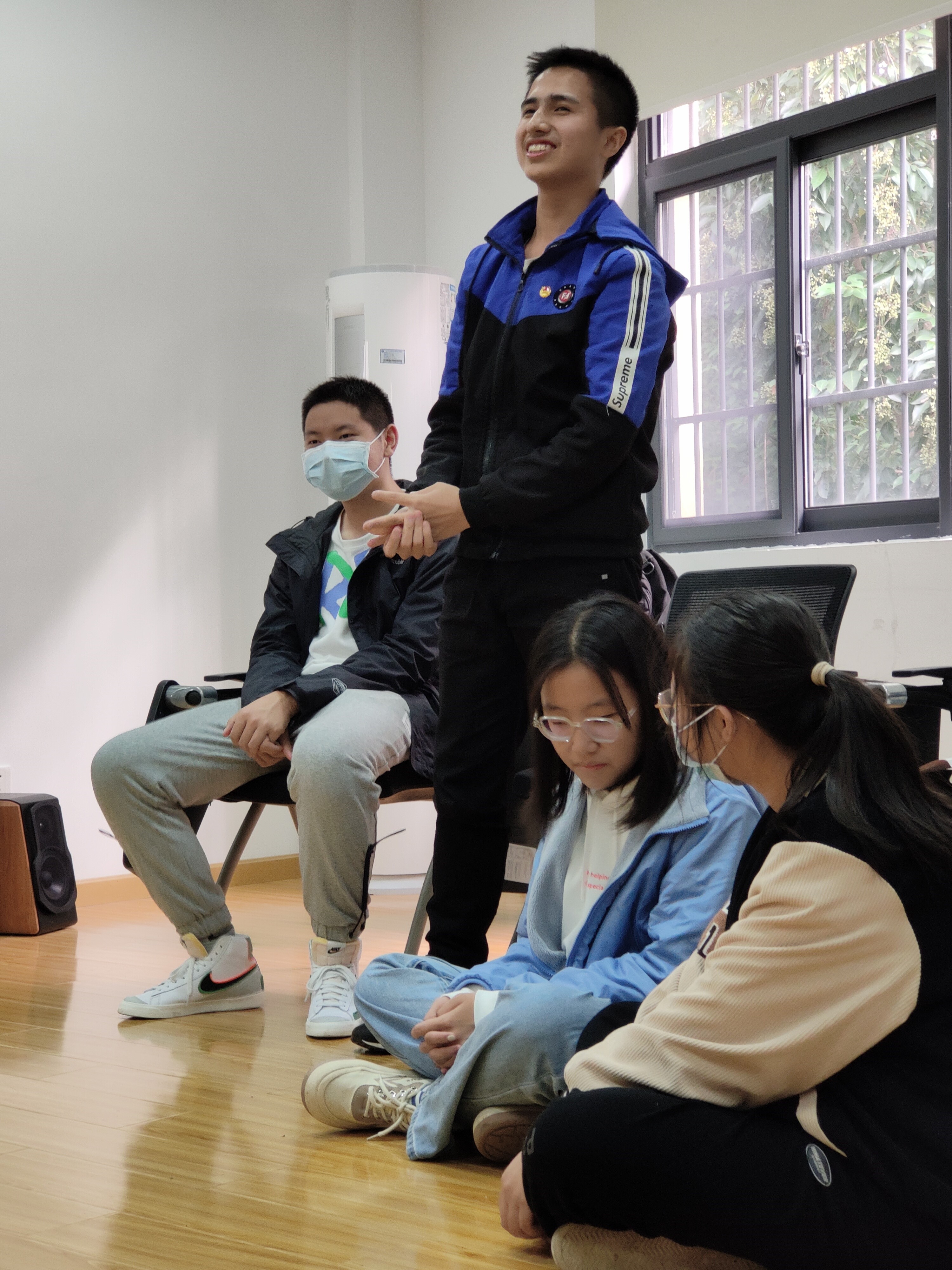“热身”完毕后,学姐又让我们玩一个叫“镜中人”的游戏,两人一组,一个人回忆自己最近情绪爆发最激烈的一次,另一个同学去模仿。游戏过程中,一组同学因为线性代数作业较多而表现出烦恼,在场同学不谋而合,情绪上达到共鸣。之后不同的小组发言表达自己的感想,一些同学说有时候想要走入别人的情绪是有难度的,所以有时候要多一份理解。