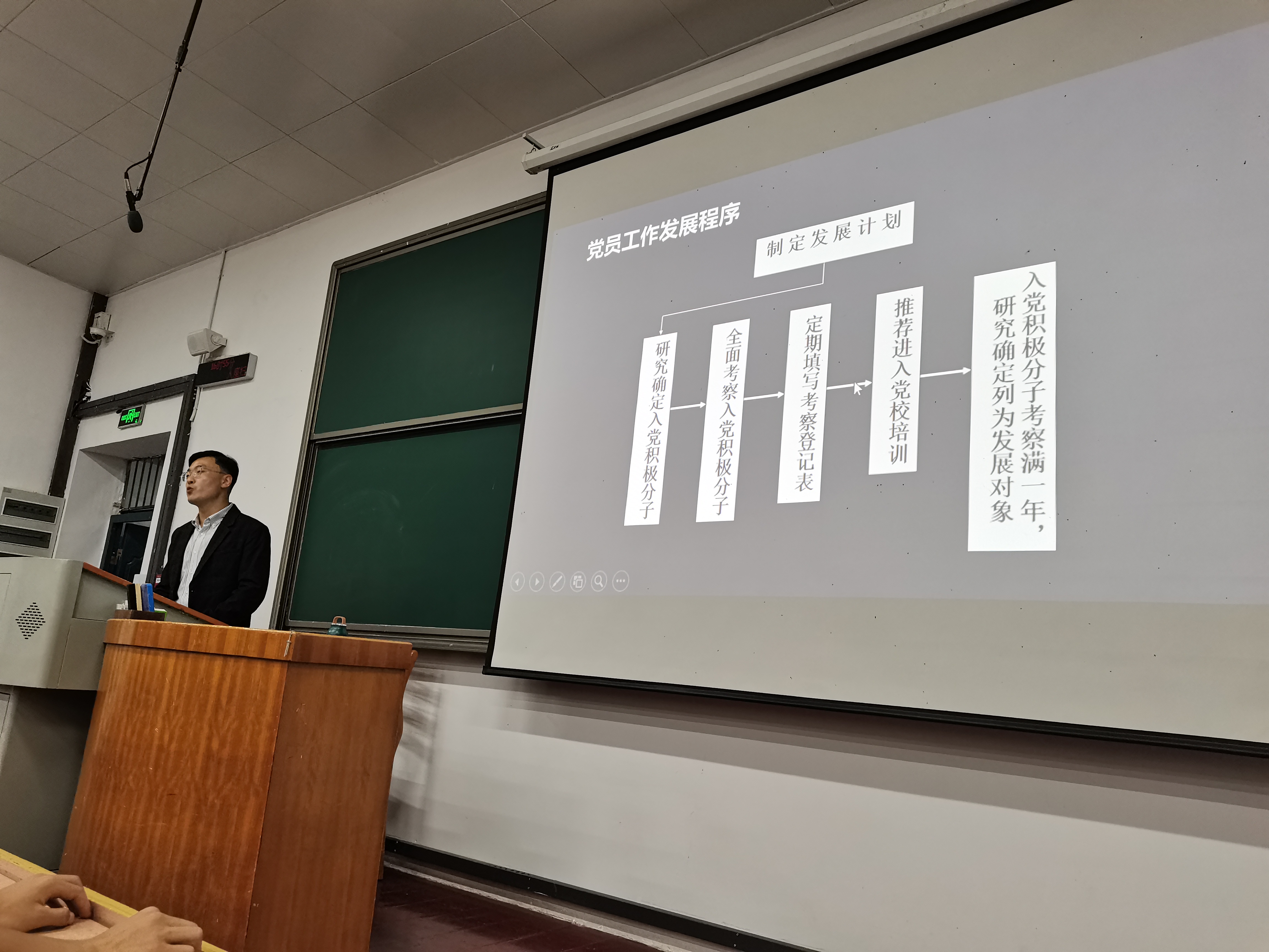 大会第二项,杨老师介绍了党员发展工作流程,依次介绍入党步骤,鼓励新生积极提交入党申请书,热爱党,拥护党,加入党。