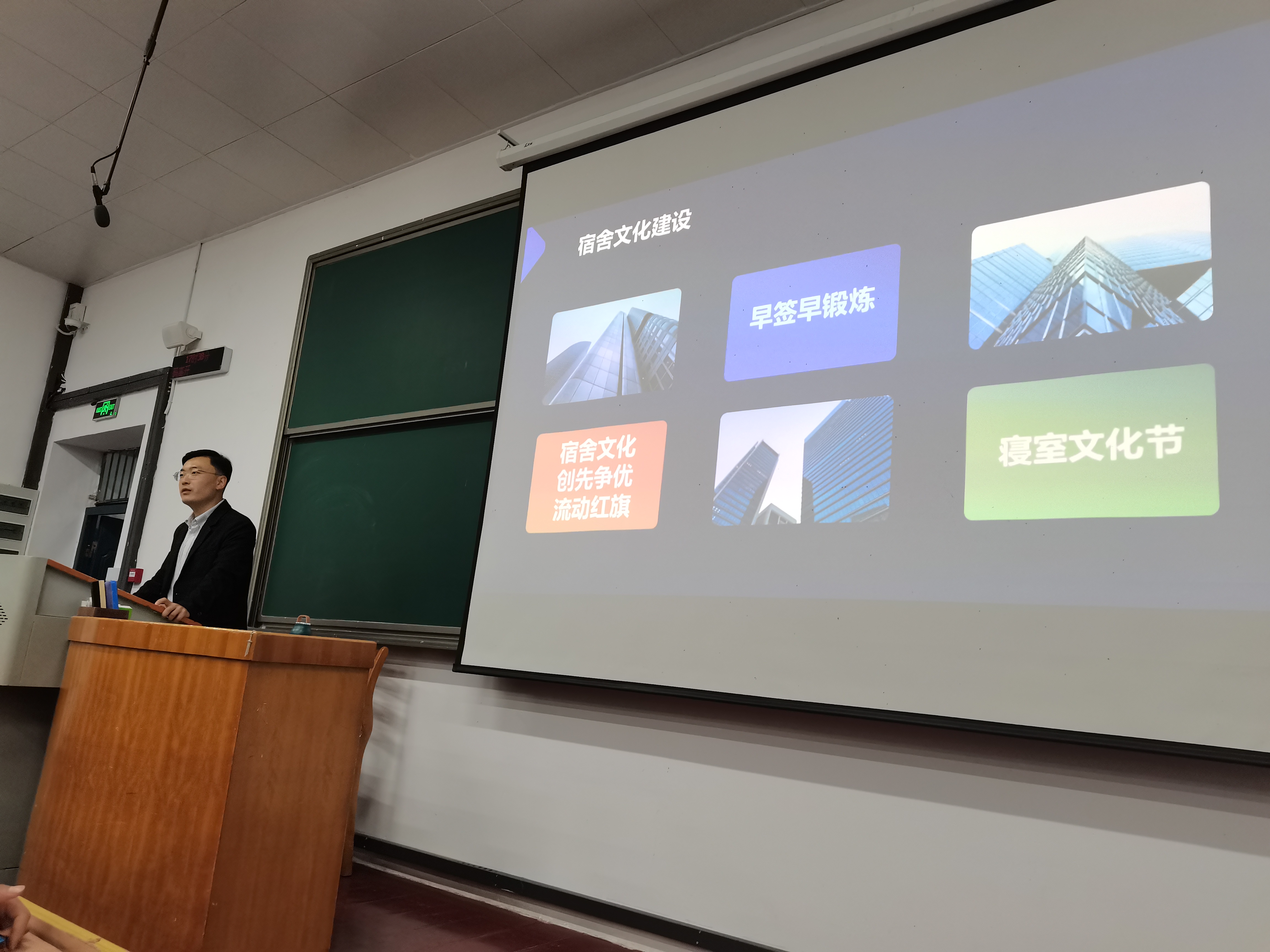 大会第四项,杨老师介绍了宿舍文化建设活动,为同学们展示了宿舍文化创先争优流动红旗活动的有关文件,鼓励同学们建设良好寝室文化,督促同学们养成良好的生活习惯,最后杨老师鼓励同学们积极参加学院即将举办的寝室文化节,共同为寝室文化建设贡献力量。