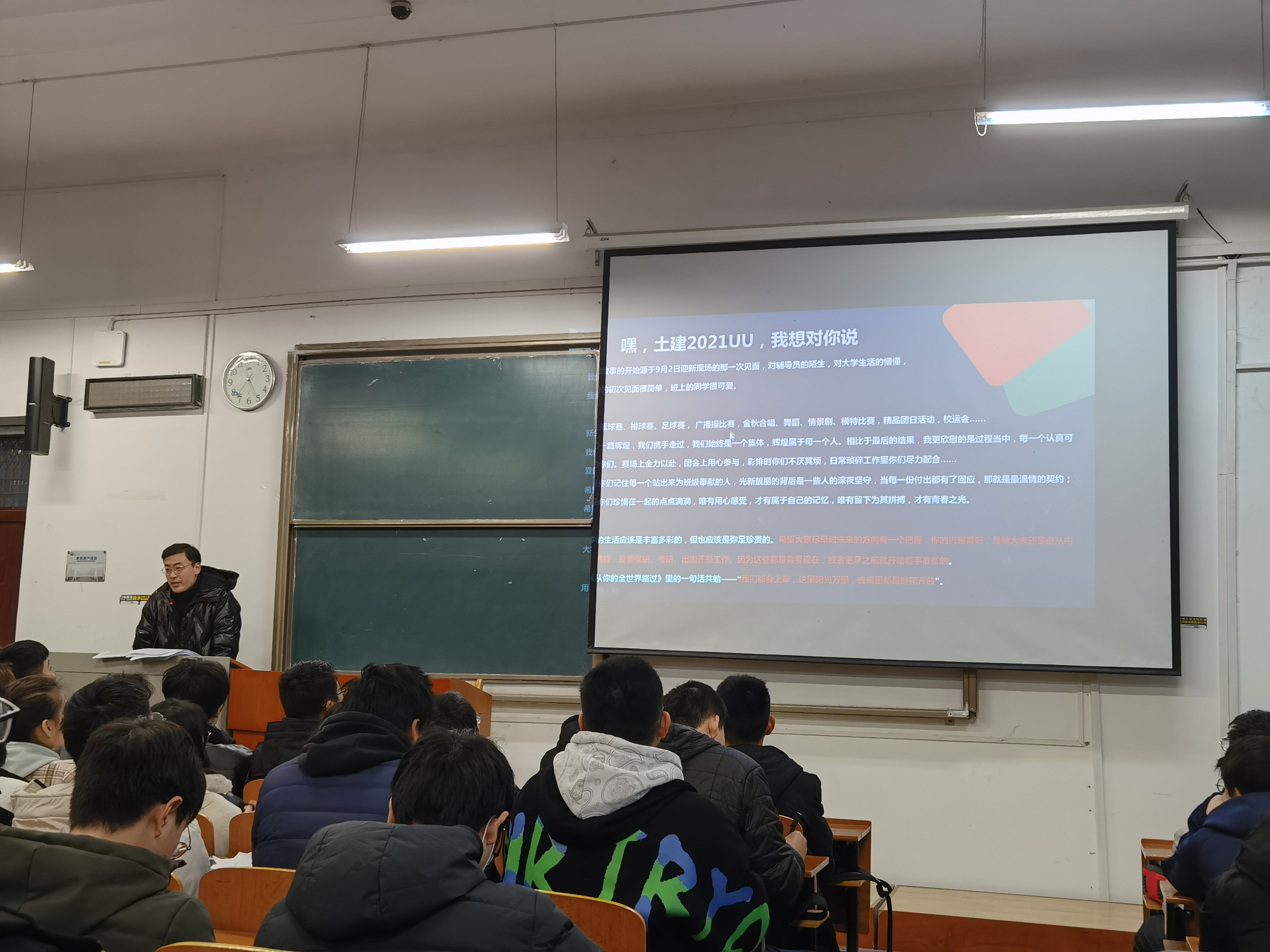 最后,杨老师带领同学们回忆了2021级新生一起走过的精彩瞬间:新生大会上的初次见面,外出参观学习的年级合影……杨老师将这些剪影汇聚起来,为同学们写下了温暖的诗歌《嘿,土建2021UU,我想对你说》,这里既包含了同学们并肩拼搏的球类赛事、广播操比赛、辩论大赛,也有美轮美奂精彩纷呈的金秋艺术节、迎新晚会,还有杨老师对新生的新年寄语和期望。