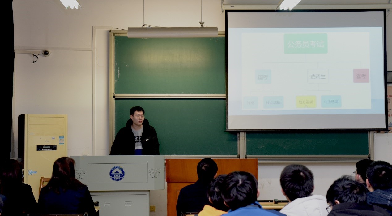 随后,学院2018级学生张智泉同学分享了公务员考试的有关经验。现在很多毕业生有意向到政府部门工作,拓宽了毕业生的就业渠道。张智泉同学结合自身考取天津市选调生的经历,为同学们分享了公务员考试的内容和技巧,展示公务员的工作特点和要求,鼓励大家相信自己,在就业时勇于挑战陌生领域,不要自我设限。