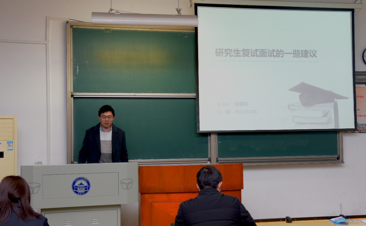 下午15:30,活动正式开始。首先,由学院市政工程系教师党支部书记——邵森林副教授讲解考研复试的注意事项。邵森林老师从面试官的角度,为大家提供了宝贵的建议,帮助大家认识到设置面试环节的目的是考查学生的综合素质,关键在于逻辑清晰、条理清楚地表达自己的观点,不要过于纠结观点的正确与否,老师的提问也不会有太强的专业性,所以面试的重点在于自然、完整地展现自己,赢得面试老师的认可。邵森林老师反复告诫学生们,面试时切忌冷场,即使一时回答不上来,也不要沉默,可以礼貌地请面试老师重复一遍问题为自己赢得思考时间。邵森林老师的精彩分享赢得了同学们的热烈掌声。
