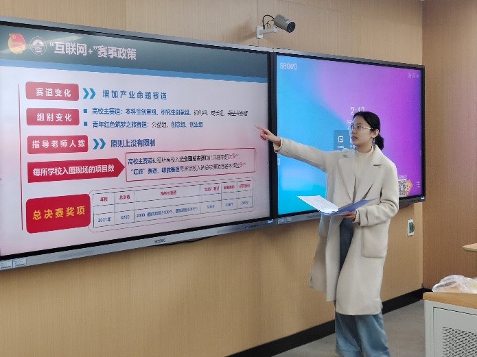 会议开始,Bsports必一体育科创竞赛宣讲团成员华以纯进行“互联网+”大赛的介绍。她讲述了该大赛各参赛赛道的参赛要求,以及今年参赛赛道作出的相关调整,通过对往年的数据进行分析,华以纯同学向大家展示了往届优秀项目取得的成果,鼓励学院师生积极备赛,踊跃参加。