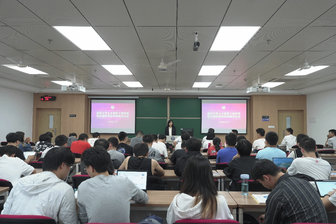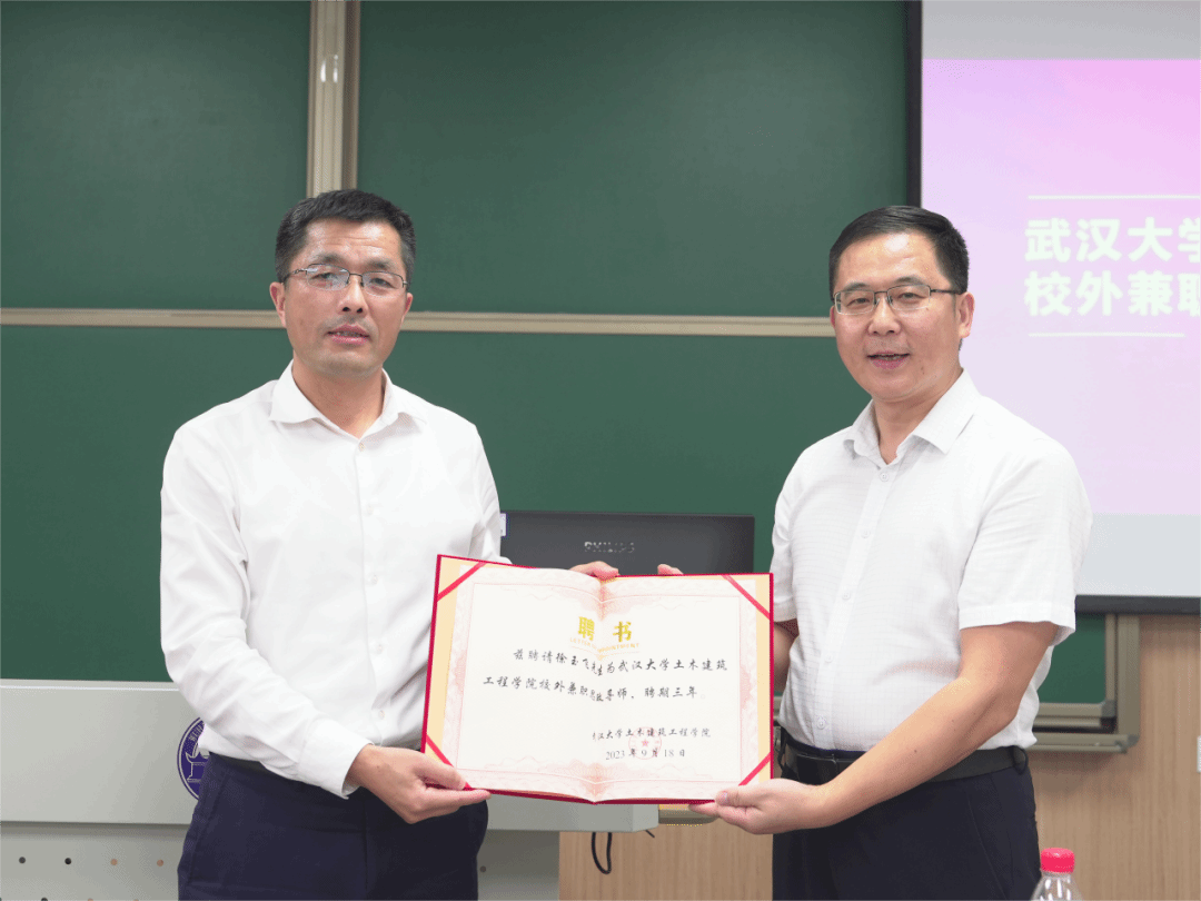 9月22日下午,Bsports必一体育在工学部一教409教室举行校外兼职思政导师聘任仪式,中建八局华中建设有限公司党委书记、董事长徐玉飞受邀出席并进行专题讲座。中建八局华中建设有限公司人力资源部负责人、学院党委副书记王忠海,学工办主任余娟,以及学院2020级本科生参加聘任仪式和专题讲座。