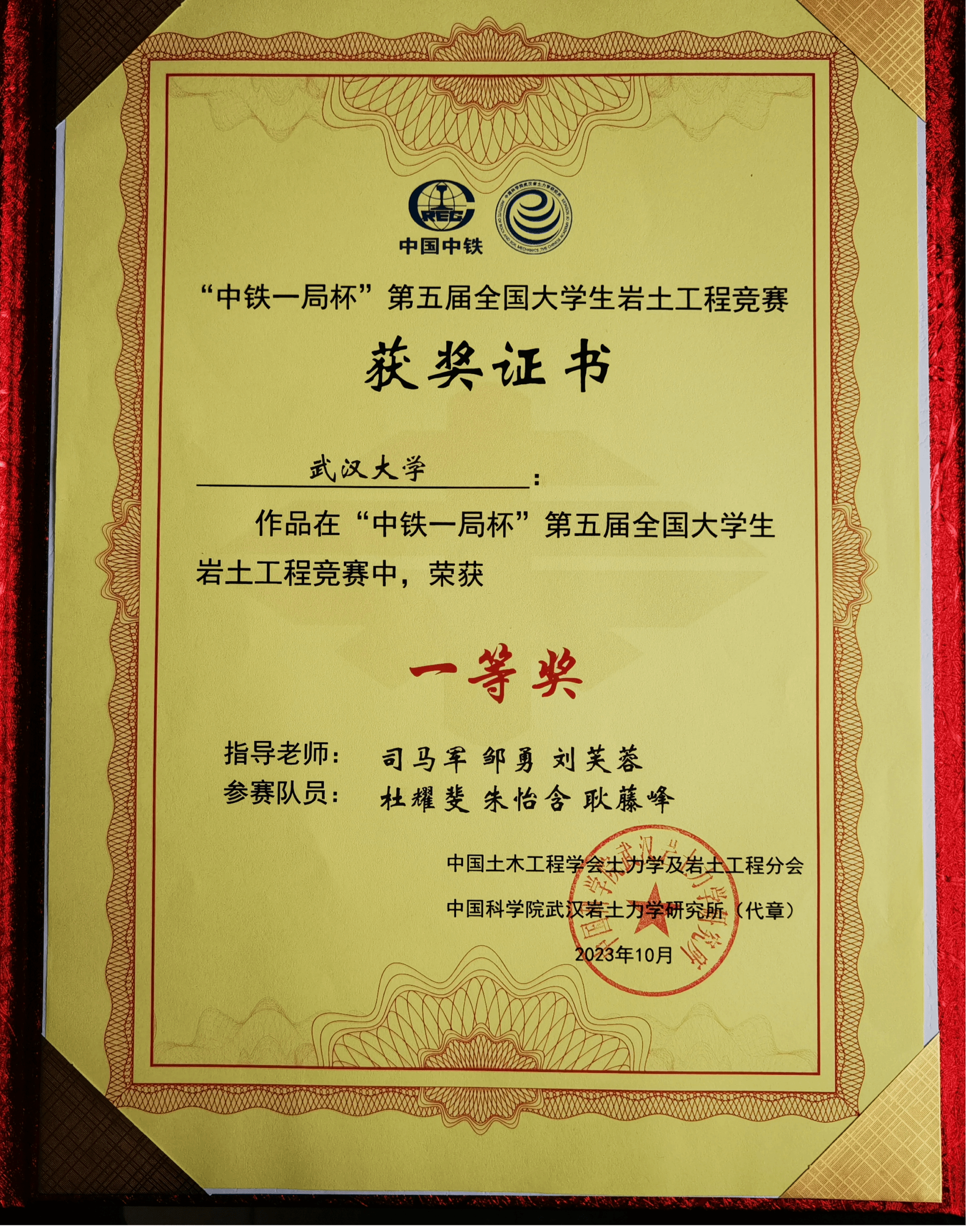 耿藤峰:有幸代表我们学院参加土木专业含金量最高的岩土竞赛,并获得全国一等奖,我感到十分开心和激动。在如此高水平平台上,我的队友和我从训练的持之以恒,到比赛时的冲劲与自信、沉着与冷静,不仅给我们自己带来收获,也展现出我们武大土木人的拼搏精神。同时感谢知道老师们的辛苦付出,没有老师们的指导,我们取得不了如此傲人的成绩。最后,希望自己以后能继续在我们土木院里面,勇攀高峰、解决难题,努力做到自己的最好!