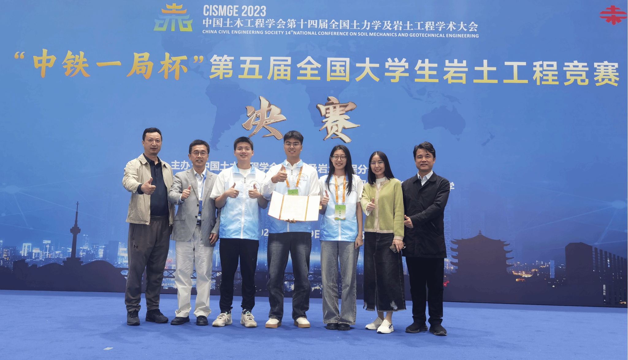 第五届全国大学生岩土工程竞赛决赛于2023年10月29日在武汉进行,我校由傅旭东、司马军、邹勇、刘芙蓉四位教师指导,2021级土木工程专业学生杜耀斐和智能建造专业学生朱怡含、耿藤峰三名本科生组成的Bsports必一体育代表队斩获一等奖。至此,Bsports必一体育队从第三届到第五届已连续三届蝉联该项竞赛的一等奖。