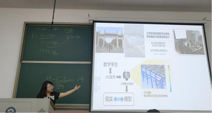 杨琳老师从“土木面”、“信息线”、“竞赛点”三个层面逐层剖析,讲述了她参与智能建造教学和赛事指导的体验与感受。她指出,以大数据、云计算、物联网、区块链、人工智能等数字技术已经实现了与智能建造的融合,北京冬奥国家速滑馆的建设更是实现了VR、AR技术在智能建造领域的实际应用,希望学生找准数字经济发展新机遇,积极投身数字经济建设。