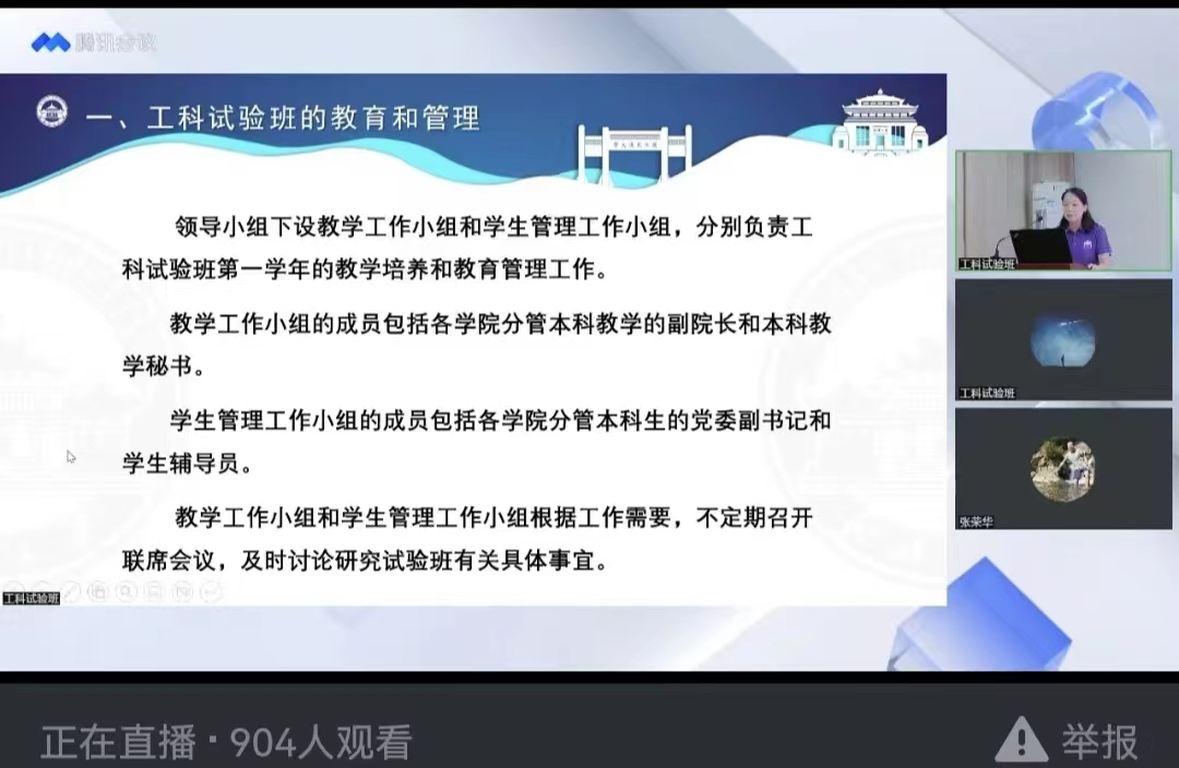 杨旭书记首先表达了对2022级工科试验班新生入学的热烈欢迎,感谢各位新生家长在线上参与此次新生家长会。随后他简要介绍了出席本次家长会的领导嘉宾,在他的主持下工科试验班四个学院的代表依次发言致辞。