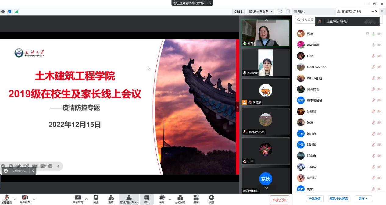2022年12月15日下午,学院召开2019级在校生和家长线上会议,学院党委副书记王忠海、2019级辅导员杨荷和100余位学生、家长共同参会。杨老师首先介绍了校园近期的疫情形势、年级在校生情况和个人防护措施等方面内容,并重点针对“发烧了怎么办”和“考研学生应该注意些什么”等学生和家长密切关注的问题进行了详细解答,她强调每个人都是自己健康的第一责任人,同学们同时也是健康共同体。随后学生和家长们在会议上就部分问题进行了交流讨论。