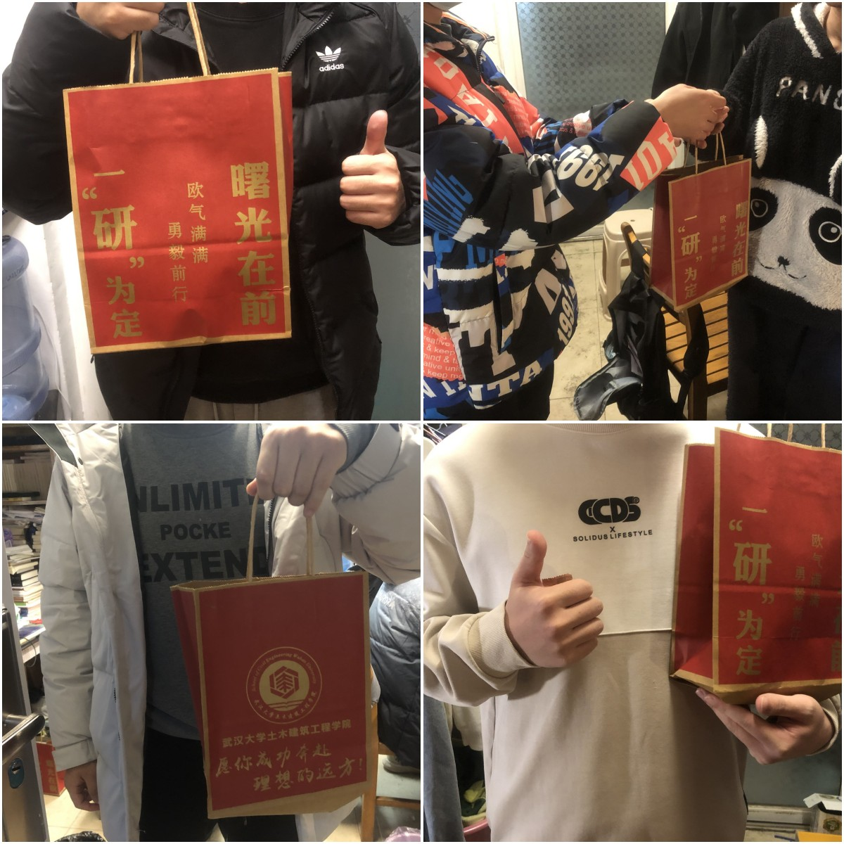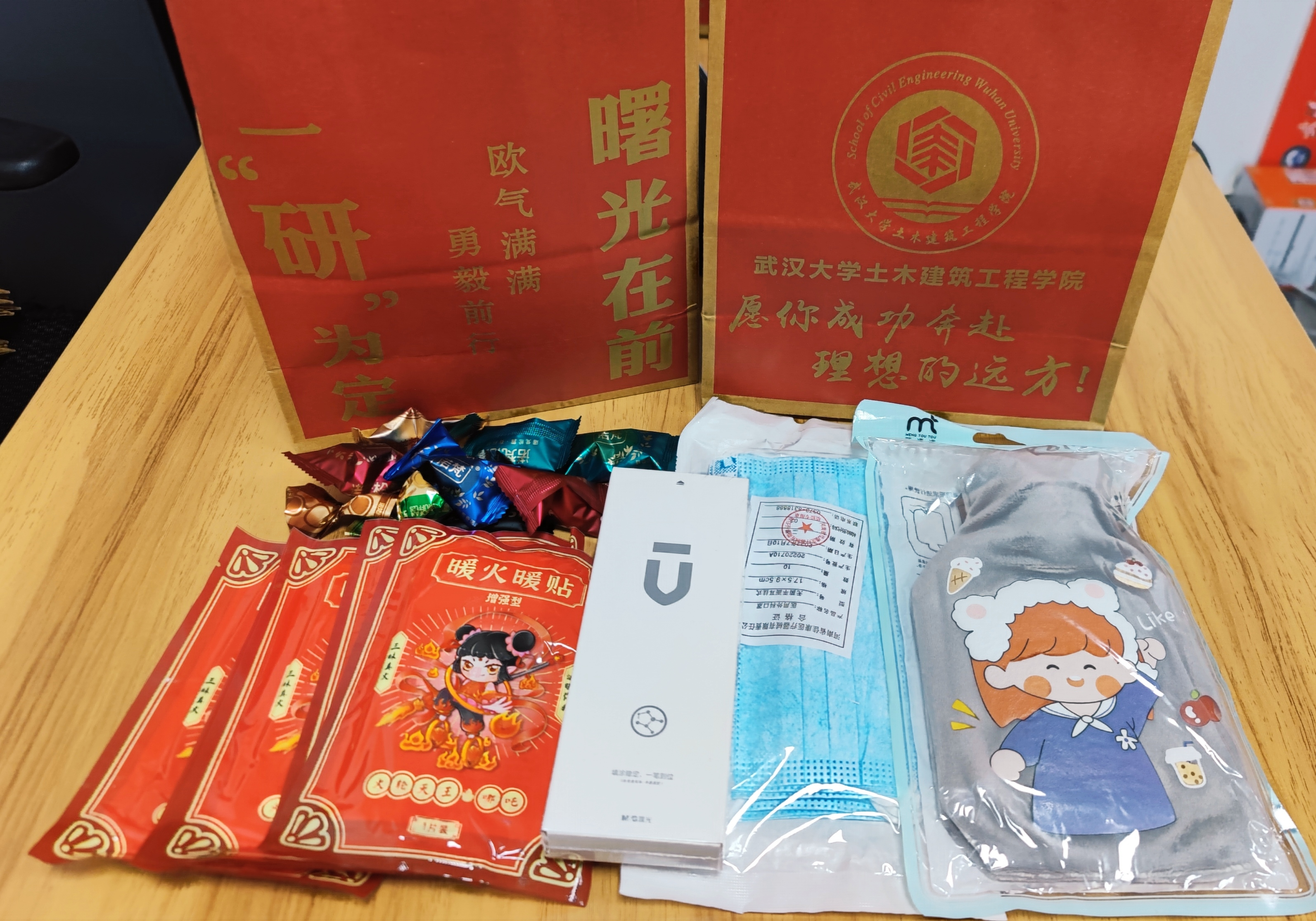 让我们一起来看看礼包中都有什么吧!巧克力、暖手袋、发热贴、涂卡笔套装、医用口罩......每一个物品都寄托了学院对考研学子的关心和祝福,既有刚需的口罩和文具,也有贴心的糖果和暖宝宝,希望考研学子在这关键的几天能够照顾好自己,调整好心态,顺顺利利地完成考试。同学们收到大礼包的同时也收获了一份好心情和一份勇气。