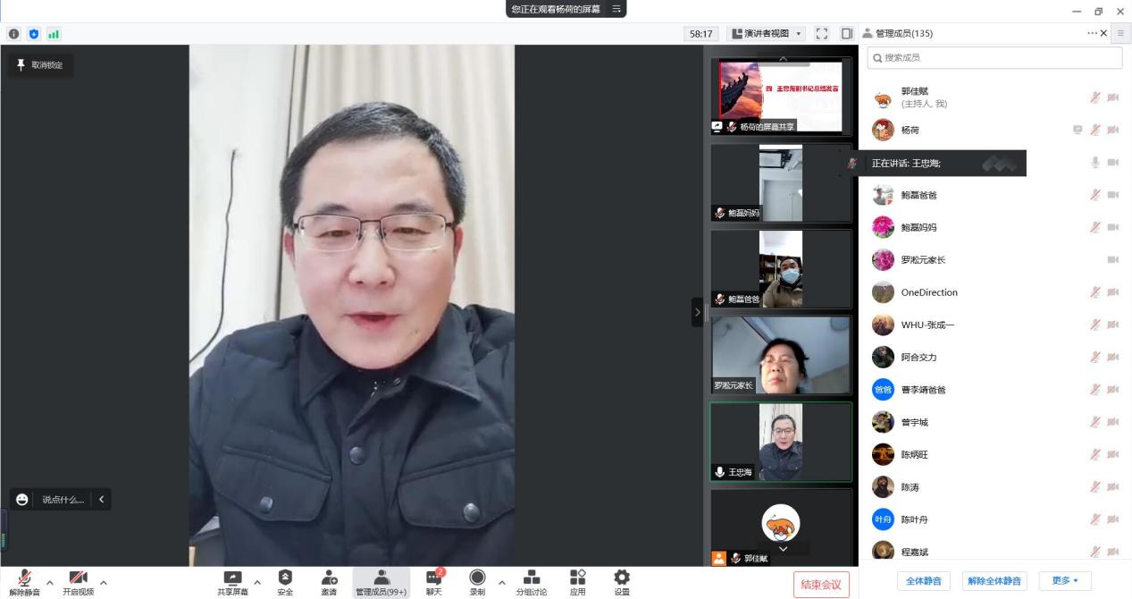会议最后,学院党委副书记王忠海老师进行总结发言。王书记从三方面进行强调,一是家长学生们要提高防护意识,注意锻炼身体;二是同学们继续发扬互帮互助精神,相互包容体谅;三是考研同学要保持学习状态,放下心理包袱。最后,王书记号召各位家长加强家校协同,和学校一起努力,共同为同学们营造良好的学习生活环境。
