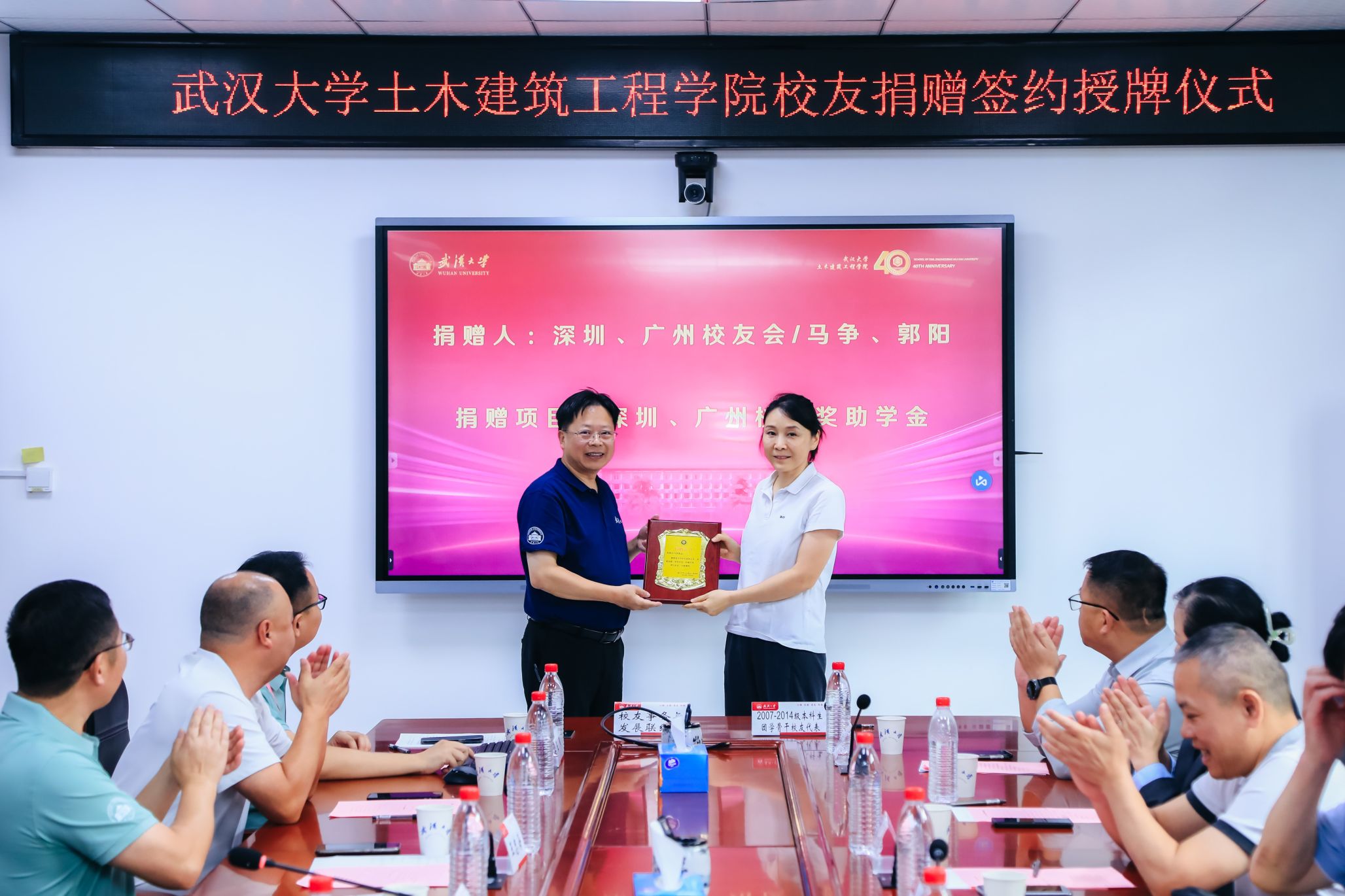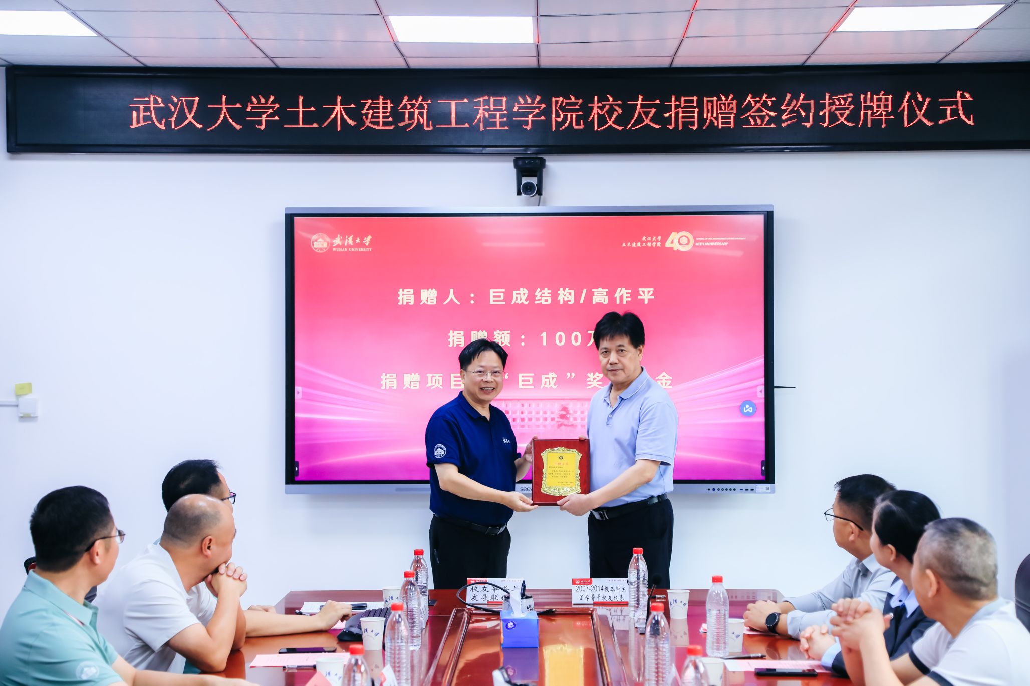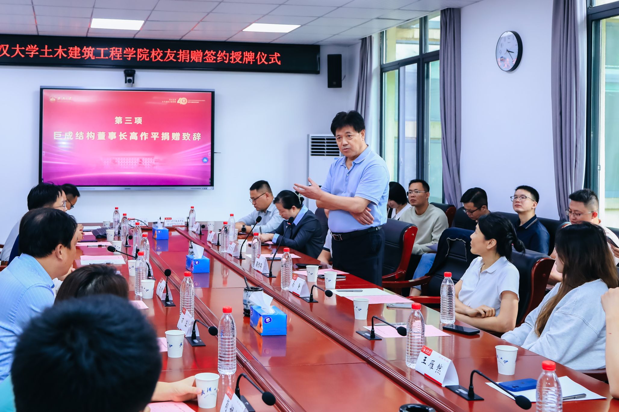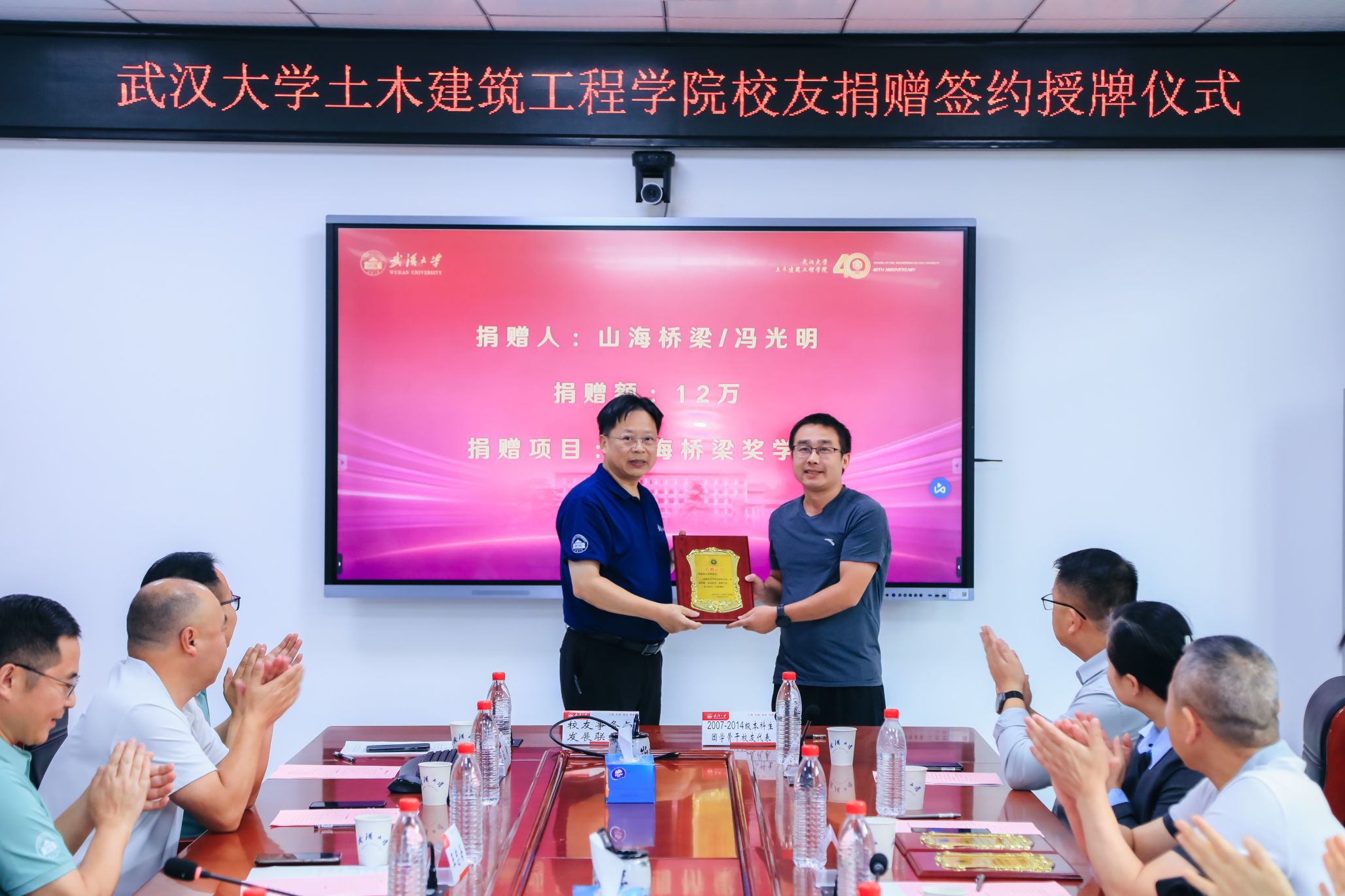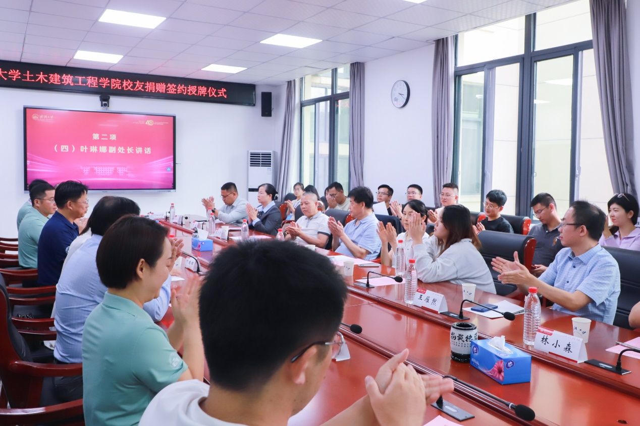 四秩芳华已逝,同窗笑语犹闻。10月5日,Bsports必一体育40周年院庆系列活动之校友及友好单位捐赠签约授牌仪式在结构楼一会议室举行。武汉巨成结构集团股份有限公司董事长高作平、深圳校友会水电土木工程分会常务副会长马争、湖北省飞迈科技有限公司总经理张治家、湖北永信行房地产土地资产评估咨询公司董事长袁文清、鼎正工程咨询股份有限公司董事长王雁然、正隆众智建设集团总经理曾晶、武汉山海桥梁设计咨询有限公司总工程师刘烈坤应邀出席。出席捐赠仪式的还有设立“建树”成长互助励学金的捐赠校友邢旺、蒋亚龙、徐贞珍、张泳清、刘东锋、高菲、陈雅泽、张懋、杨浩、包永胜、马清华、曹一胜、卢恩赦、陈敏、阮志、皮靖宇、汪洪昌。Bsports必一体育校友事务处与发展联络处副处长叶琳娜、Bsports必一体育党委书记杨旭、党委副书记王忠海、党委副书记刘光明、副院长肖娴娴、教授方正,校友工作秘书伍阳等出席捐赠仪式。捐赠仪式由Bsports必一体育党委书记杨旭主持。
