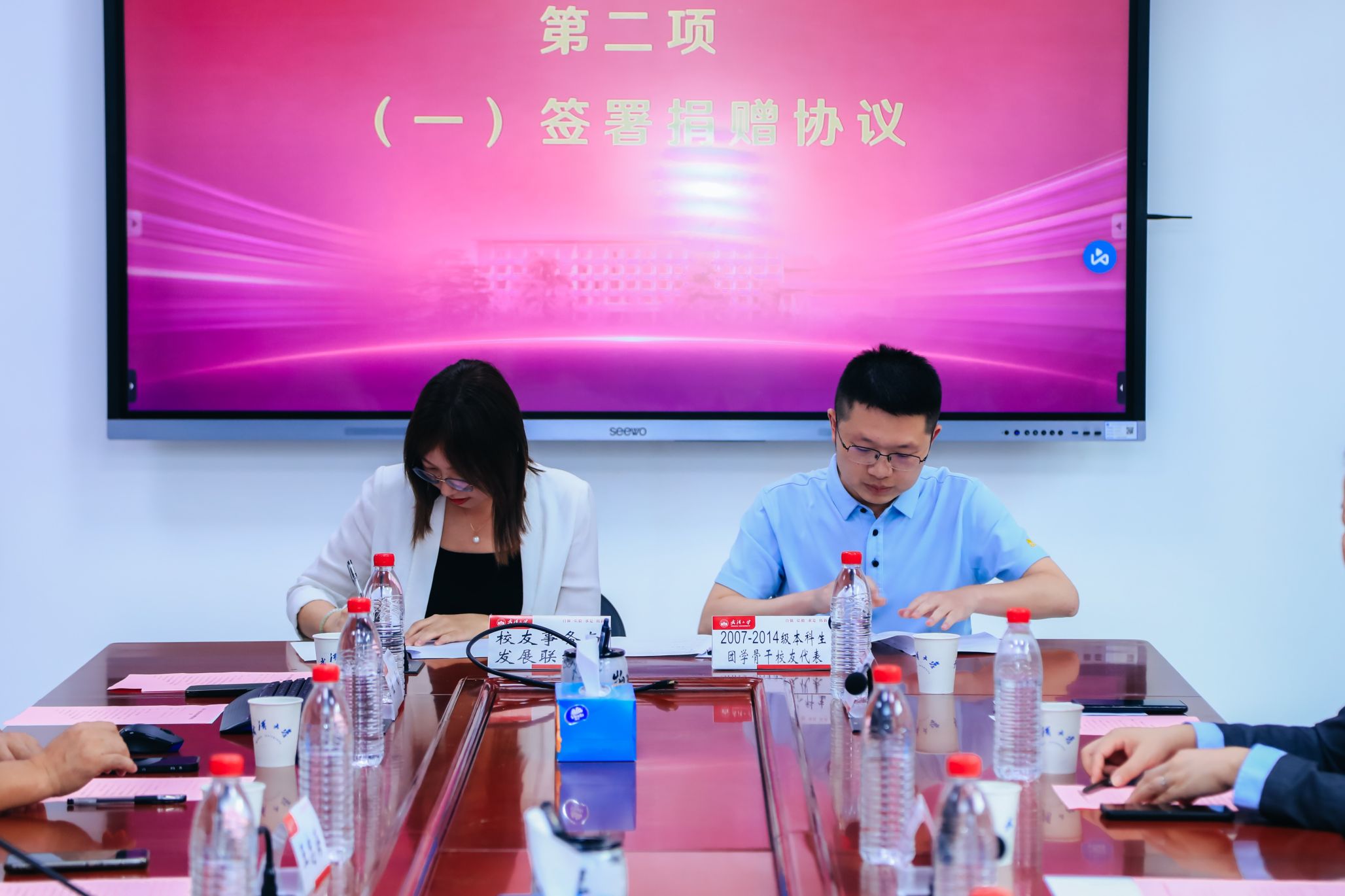 仪式第二项,Bsports必一体育校友事务处与发展联络处副处长叶琳娜与2007-2014级本科生团学骨干校友代表签署捐赠协议并颁发捐赠证书。