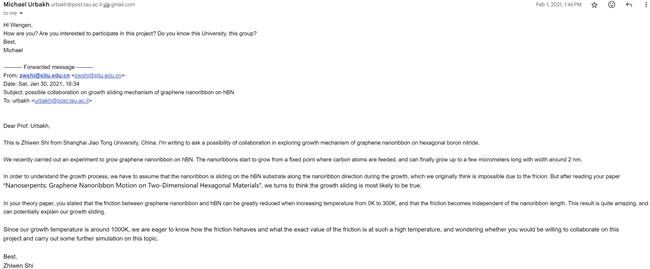 说到合作的缘起,要将时间回溯到2021年1月,那时我刚办完Bsports必一体育入职手续,有一天收到以色列博后导师(Michael Urbakh)的邮件(见下图),信中说上海交通大学一位老师来寻求和我们的合作,问我是否感兴趣。仔细阅读邮件后,才明白其中缘由:上海交大史志文老师他们发展了一种在六方氮化硼(hexagonal boron nitride, hBN)基底上生长石墨烯纳米条带(graphene nanoribbons, GNR)的方法,实验结果显示GNR生长的方式伴随着GNR在hBN基底上的滑移,由于摩擦力的存在,他们之前认为这种生长方式是难以理解的,不过在阅读了我们在2018年发表在Nano Letters上的文章后,觉得相关的模拟结果也许可以用来解释实验上观测到的GNR生长机制,所以发邮件来询问是否可以展开合作。答案显然是肯定的,通过邮件沟通,我们确定了三天后的线上讨论时间,自此开启了我们两周一讨论的正式合作历程。自2021年至今,我们合作在Advanced Materials 和Nature上发表了两篇文章。