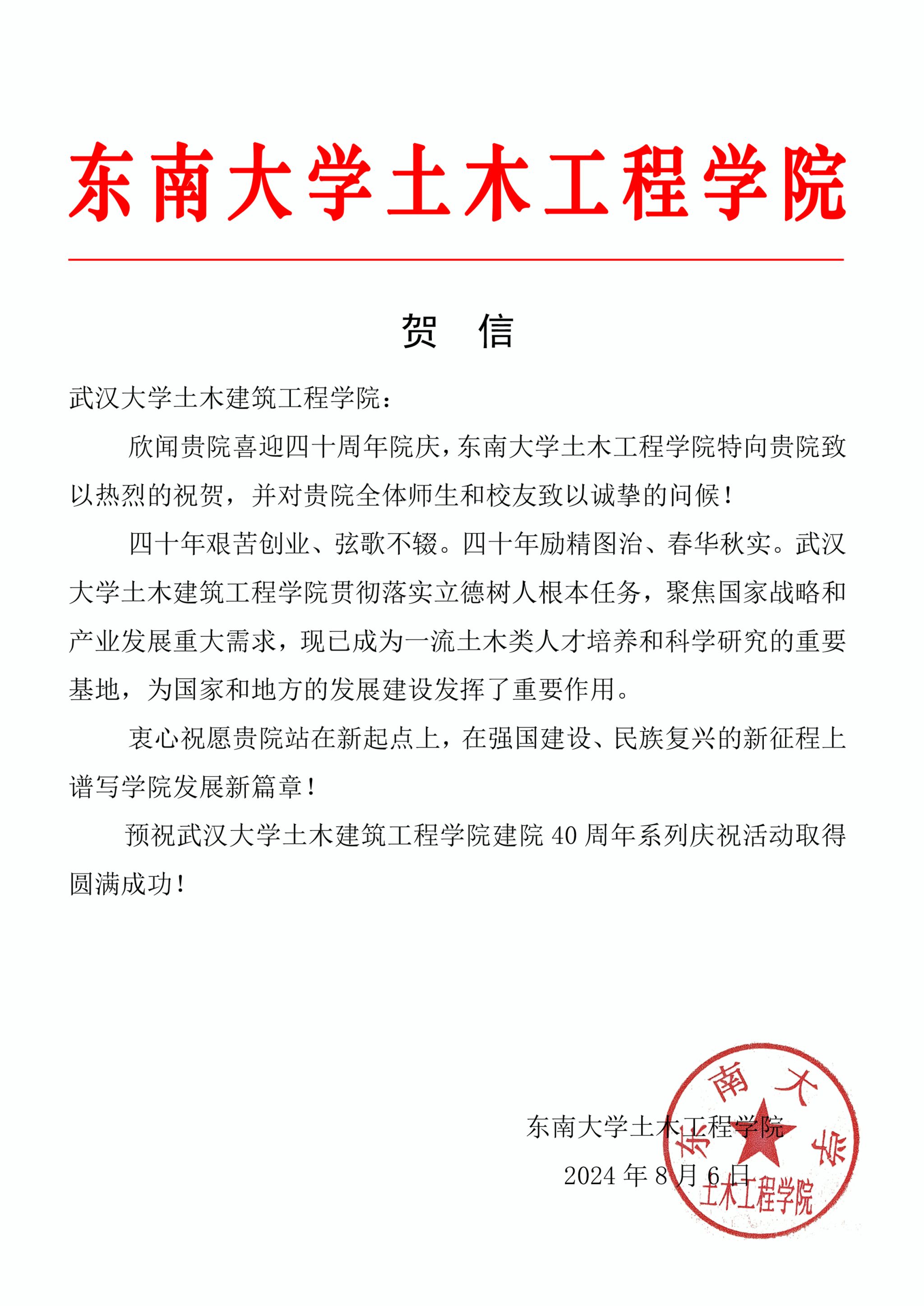 东南大学土木工程学院贺信